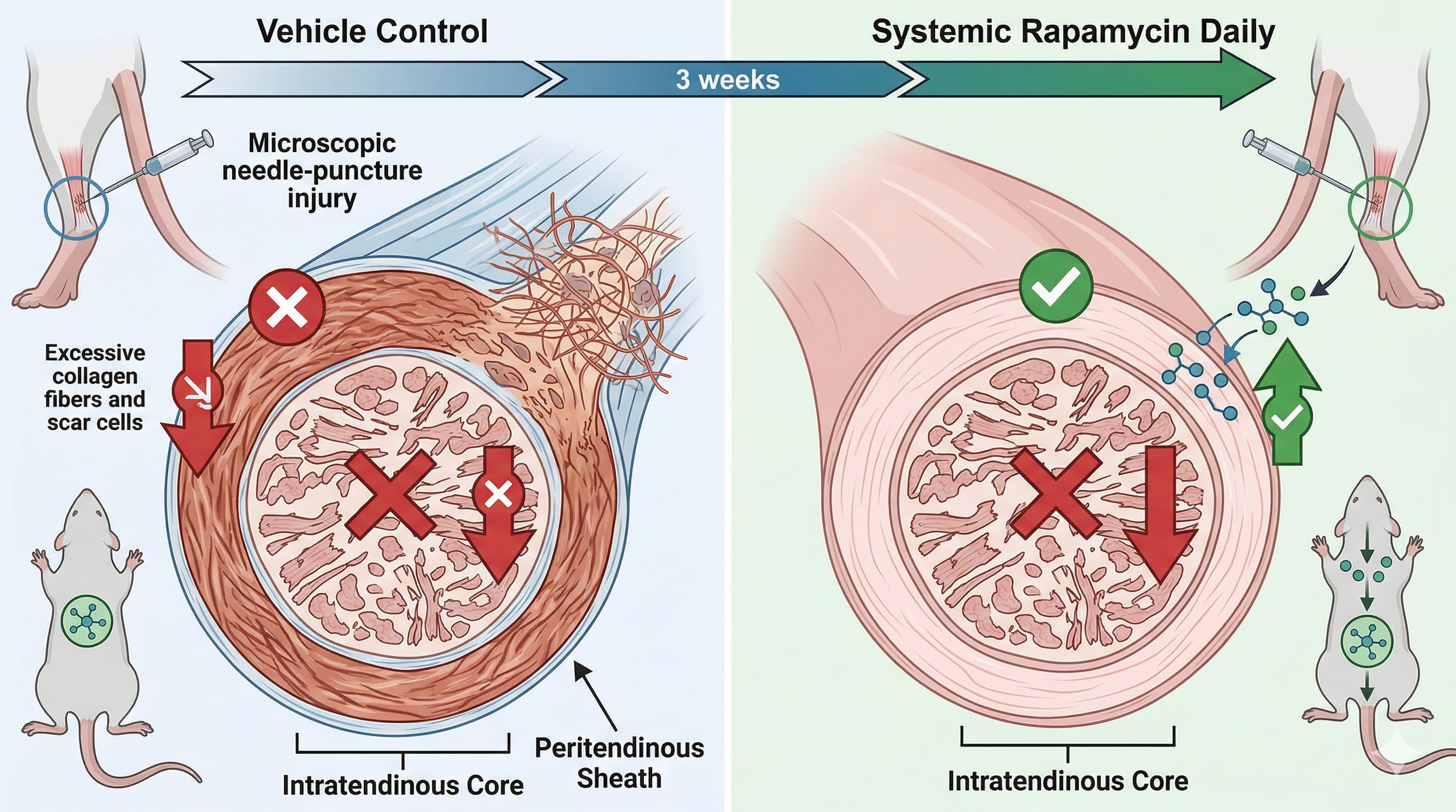 Researchers investigated whether systemic, daily administration of rapamycin could enhance Achilles tendon healing in a rodent needle-puncture injury model. The findings reveal a stark spatial divergence in the drug’s efficacy. Over a three-week observation period, rapamycin successfully attenuated peritendinous fibrosis—the scarring on the outer sheath of the tendon. However, it completely failed to improve the regenerative healing within the intratendinous core.