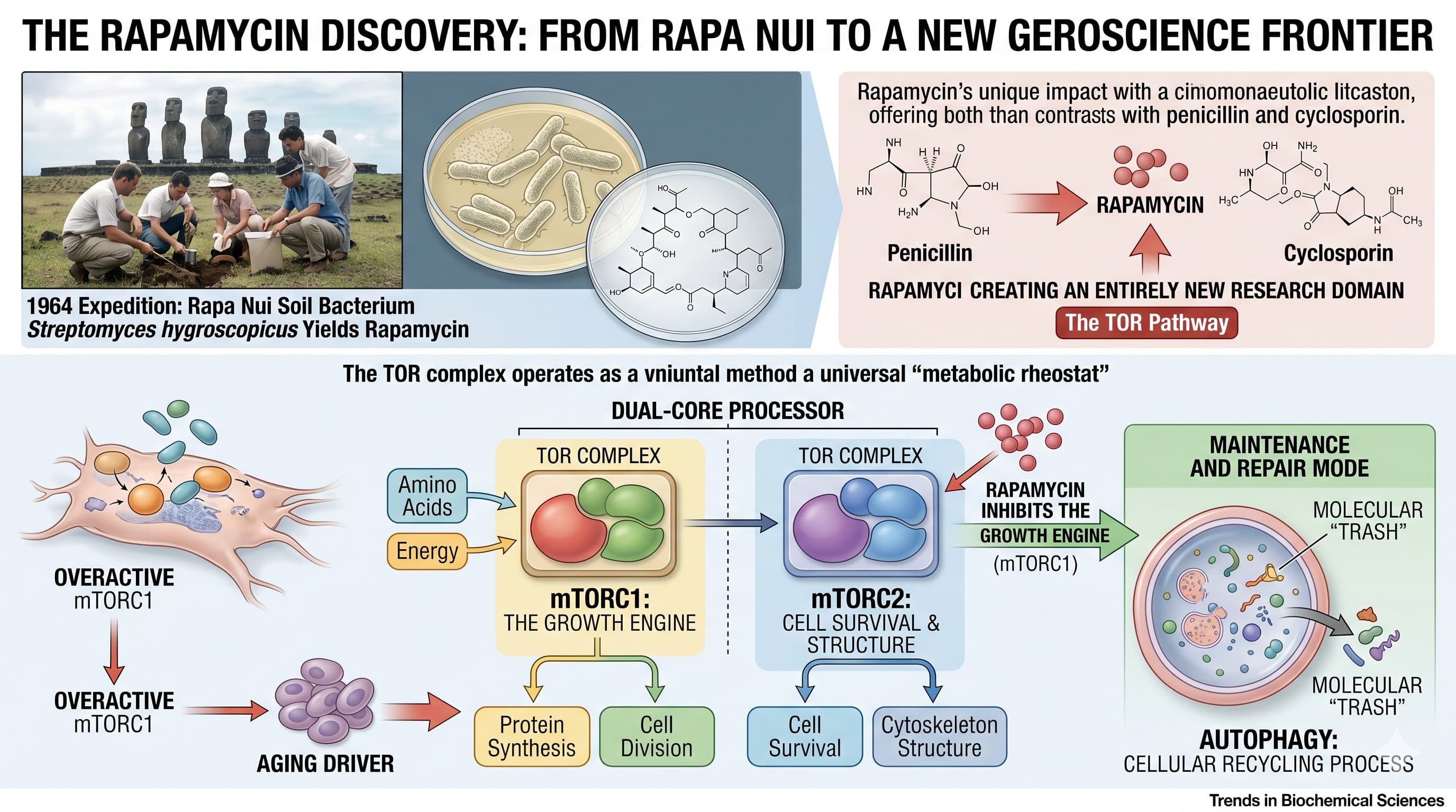 Published in Trends in Biochemical Sciences , this feature review marks the 50th anniversary of rapamycin’s first reporting. Unlike penicillin or cyclosporin, which merely expanded existing fields, rapamycin is unique because its study actually created an entirely new research domain. It revealed the Target of Rapamycin (TOR) pathway, a universal “metabolic rheostat” that exists in everything from yeast to humans.