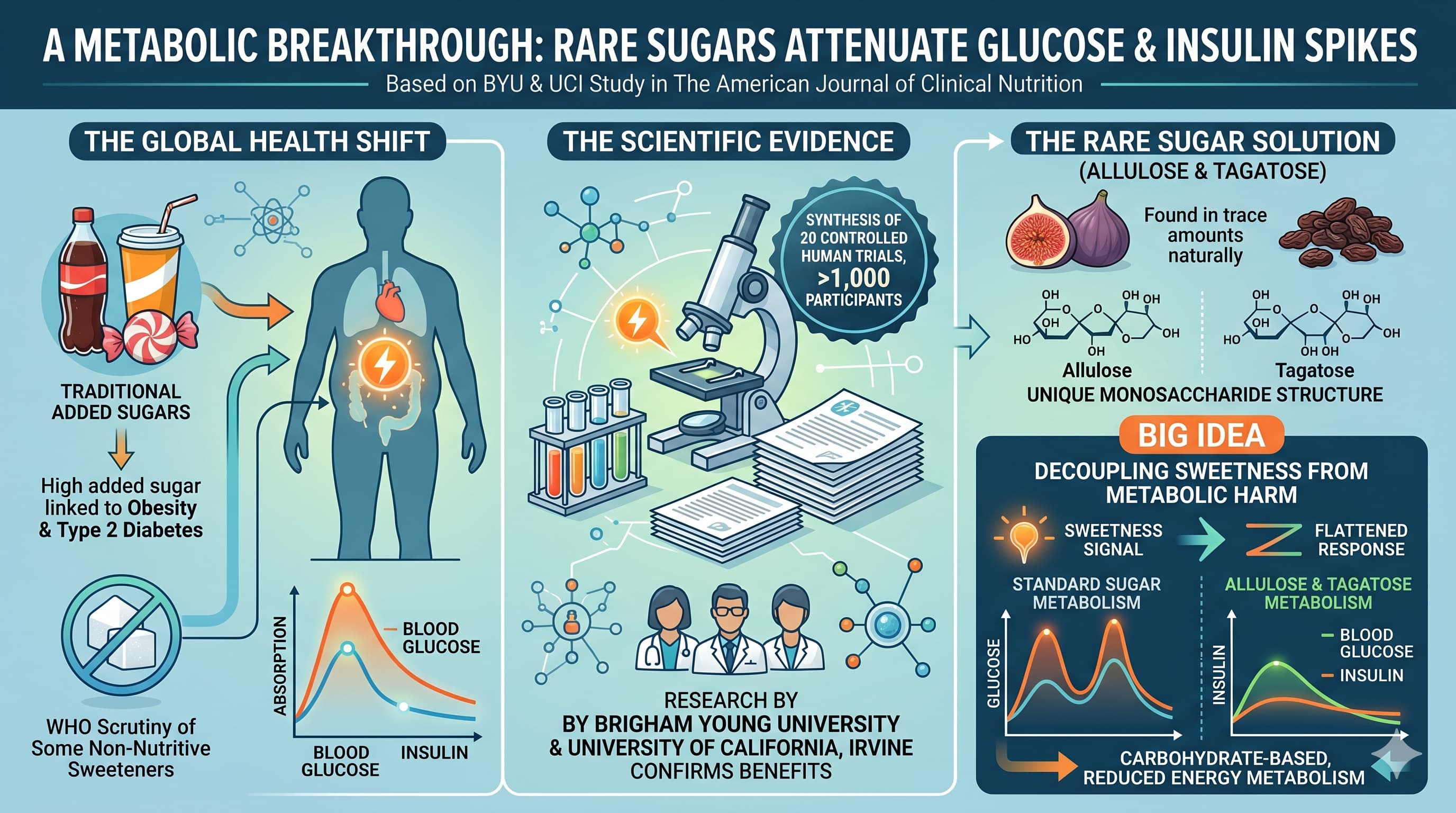 The study synthesized data from 20 controlled human intervention trials involving over 1,000 participants. The “Big Idea” here is the decoupling of sweetness from metabolic harm. Unlike non-nutritive sweeteners (like aspartame) which have faced recent WHO scrutiny, rare sugars are carbohydrate-based but possess unique structures that prevent them from being fully metabolized into energy.
