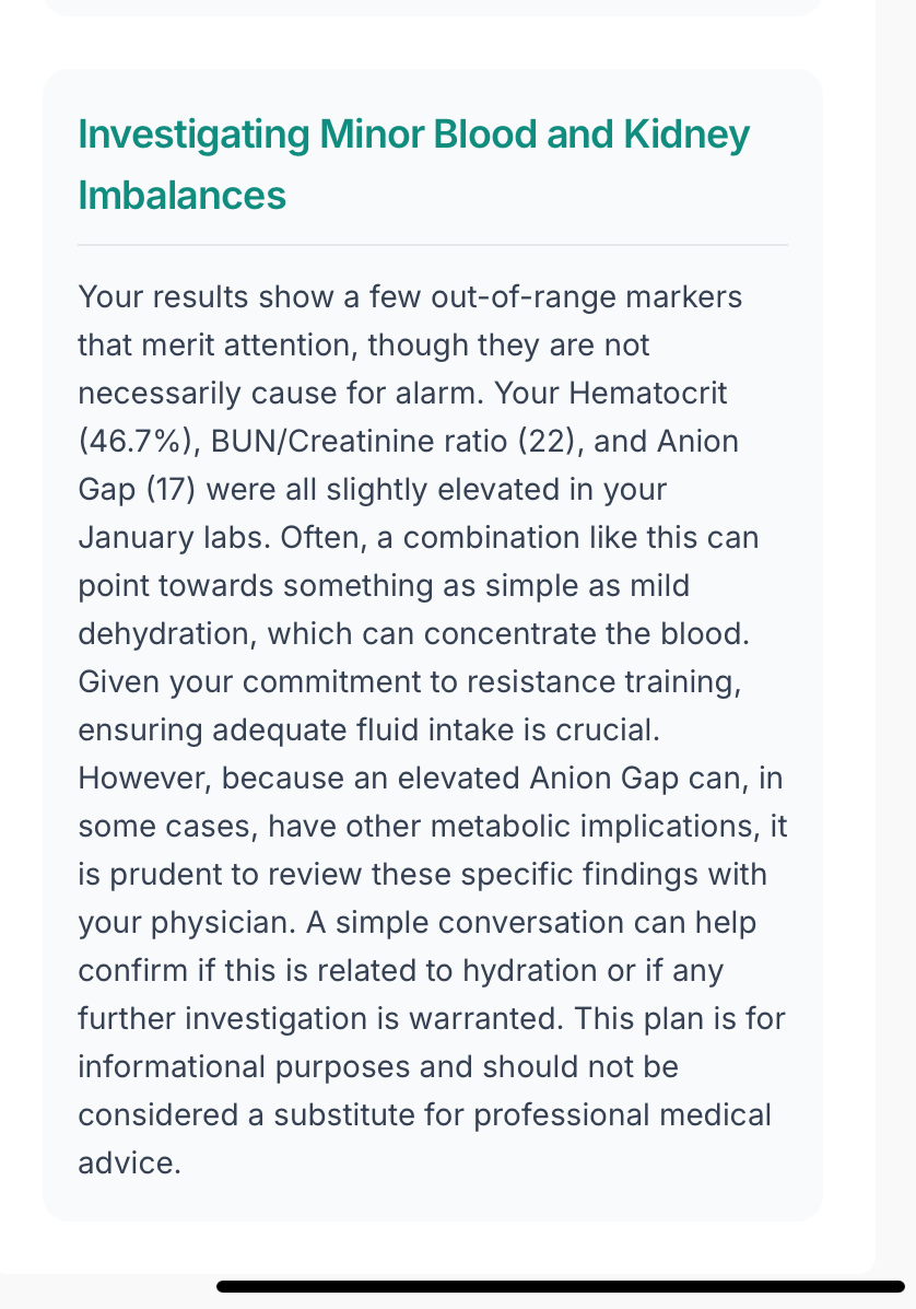 It pointed out my Anion Gap (which I’ve never heard of) was out of range. It notes that might have been due to dehydration. I’ve included a couple of screen shots below.