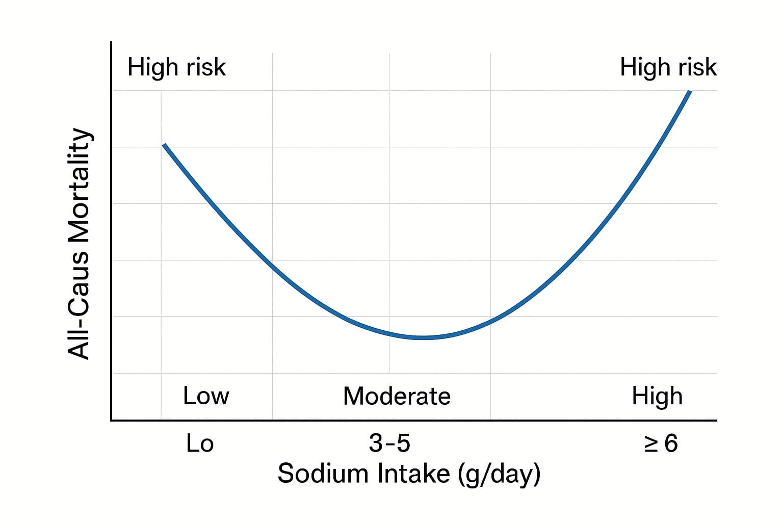 - Mortality rises again at high intake (> ~5–6 g/day sodium ≈ >12.5–15 g/day salt).