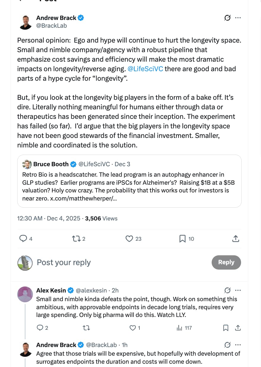 The more the merrier. Can’t hurt, might help. Having said that, the results of similar efforts by Silicon Valley tech bros, like the Google effort have shown very disappointing delivery - at least so far. It is my suspicion that the tech bros are not familiar with the special requirements of medical research, and not being familiar with the field, tend to hire random people to put in charge, with poor results. They need to put someone like Matt Kaeberlein in charge of the research, but not knowing the field, they don’t know of MK. Look at Bryan Johnson, another tech bro - his whole approach is like a tech startup, throwing everything and the kitchen sink at the body assuming that somehow all of this synergizes and optimizes in an additive manner. And he ends up with a giant pile of higgedly piggedly heaped together supplements, drugs and interventions. Who is in charge of all this, and does he know who is truly qualified?