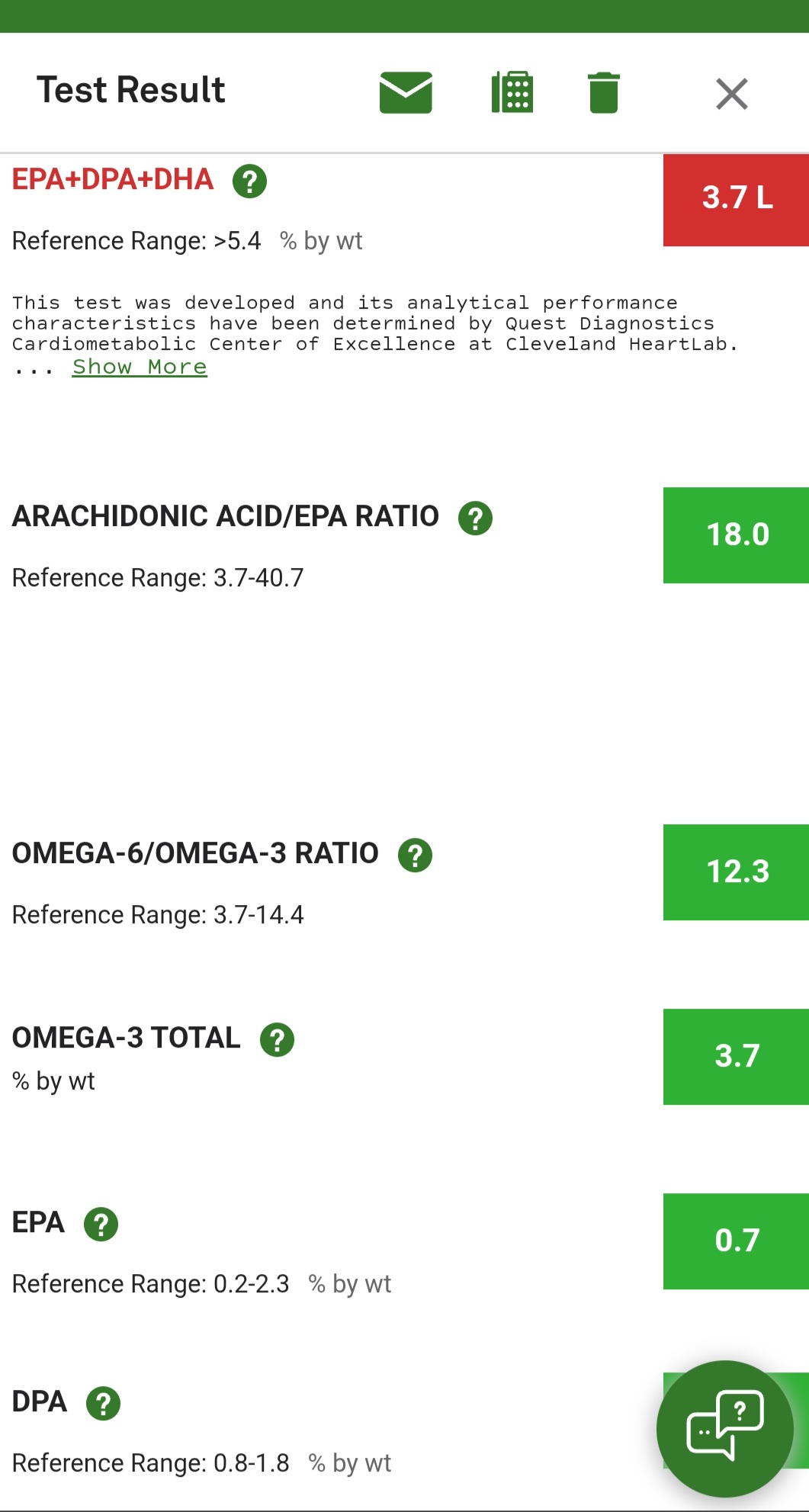 Incase it’s relevant, I don’t eat fish but I take algae supplements for my omega 3s. My omega 3 level was almost 8. Just slightly low.