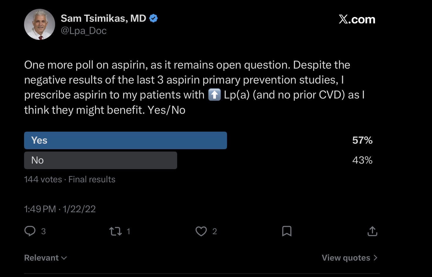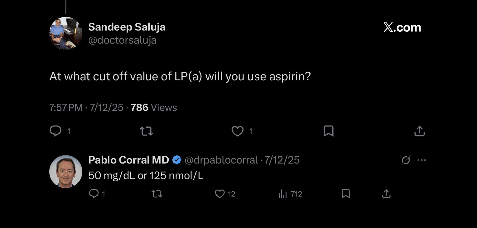 If you are older and have very high lp(a) and you are consulting a cardiologist or lipidologist that specializes in treating patients with lp(a) it is highly likely that they will recommend low-dose aspirin if you are not otherwise at a high risk of bleeding. If they don’t, and particularly if they don’t discuss it, that would be a red flag on your choice of physician. I’m not saying that a GP or an ER doctor would recommend aspirin.