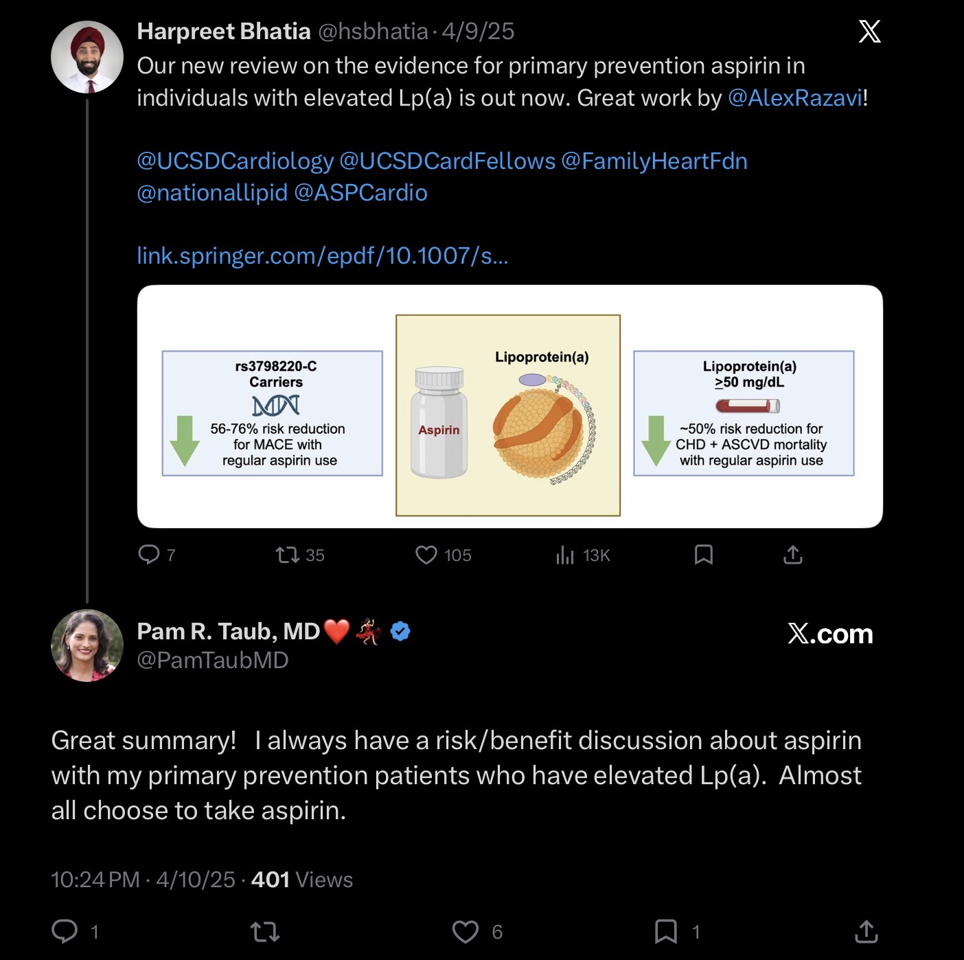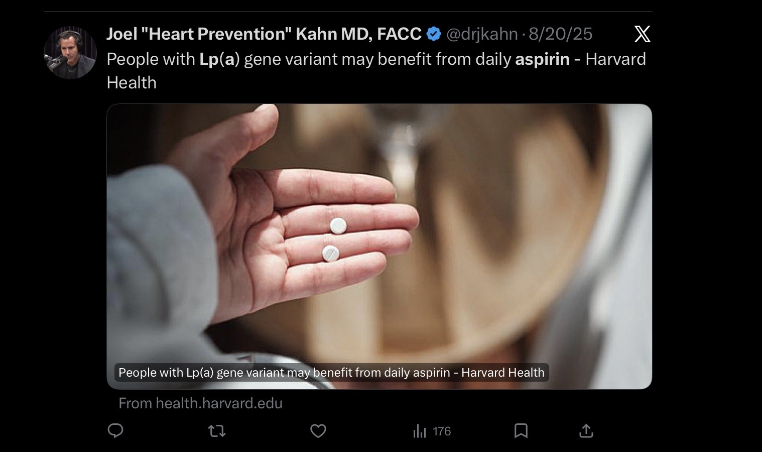 Again, you’re not a cardiologist and so there’s no harm in your following the guidelines. But people that actually deal with people with high lp(a) don’t wait for guidelines to change. Europe and Canada recommended testing for lp(a) a decade ago. We changed only our recommendation this year. The guidelines don’t recommend testing for ApoB even though it is clear evidence that risk follows ApoB and not LDL-C when they diverge. I know a doctor from MD Andersen who has similar levels to mine. He’s in his 40s and he takes daily aspirin. You clearly didn’t read any of the studies I linked.