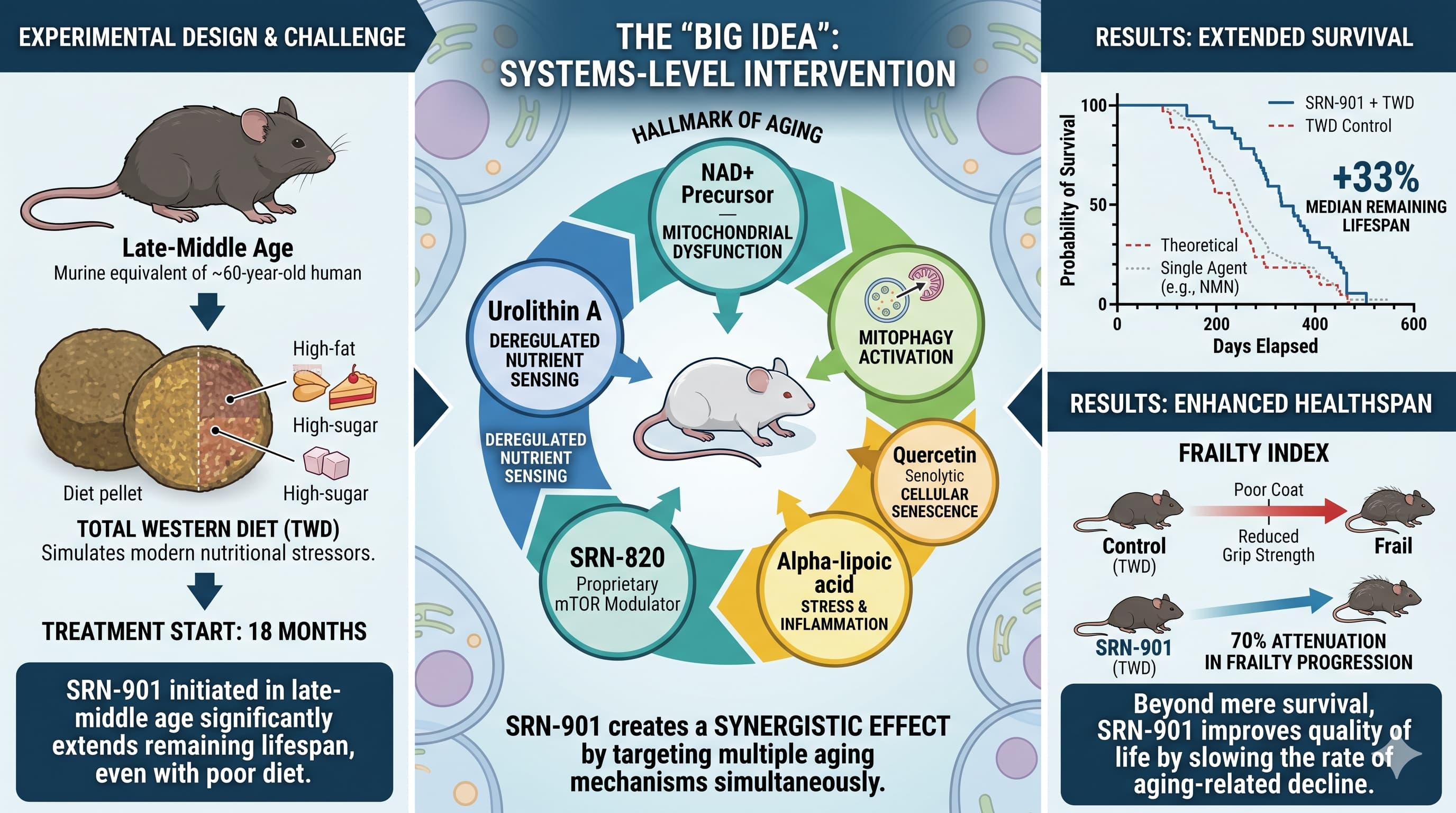 Recent research published in April 2026 marks a potential shift in geroprotective strategies, moving away from “magic bullet” single molecules toward complex, multi-target cocktails. The study investigates SRN-901 , a novel oral formulation that successfully extended the median remaining lifespan (not total lifespan) of 18-month-old mice by 33% (but only 10.7% increase in median total lifespan). This is particularly significant as the treatment was initiated in late-middle age—the murine equivalent of a 60-year-old human—while the subjects were fed a “Total Western Diet” (TWD) to simulate modern human nutritional stressors.