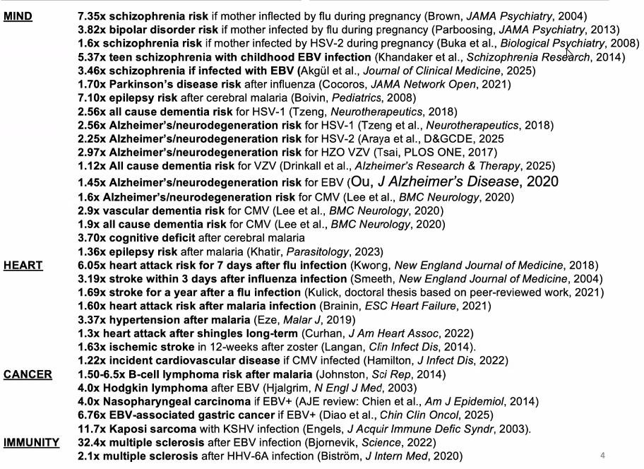 - Most of the numbers on your slide are relative risks from observational studies. They show associations but don’t always prove that the infection directly causes the later disease.