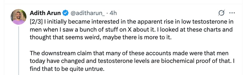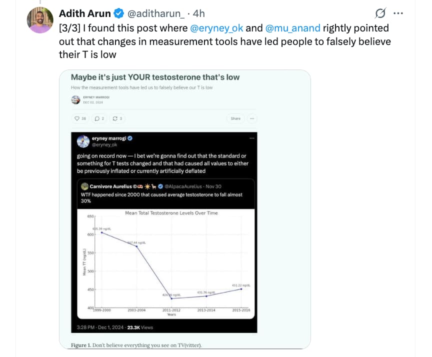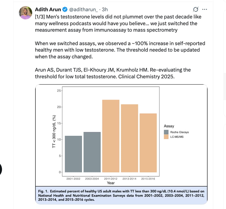 This is very interesting. Someone asked Grok if that was true in the thread and Grok said it was a good theory. To be honest, I am not surprised. I think low testosterone is largely a product of obesity anyway and to a lesser degree, environmental factors.