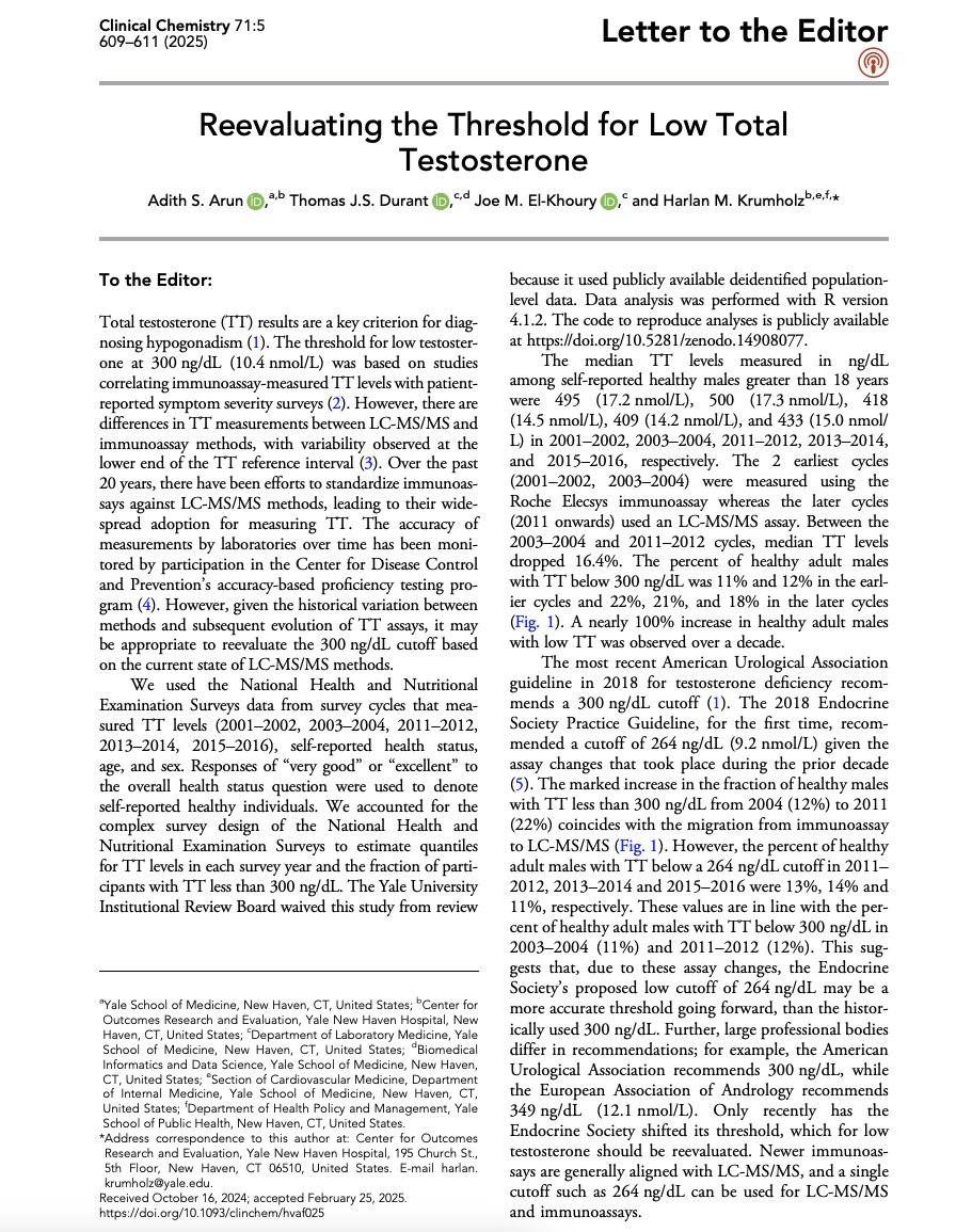 They’ve lowered the low and high end of the reference range multiple times. Men with testosterone that would previously have been flagged as low are now “low normal”. If they have symptoms they need to fix it or treat it.