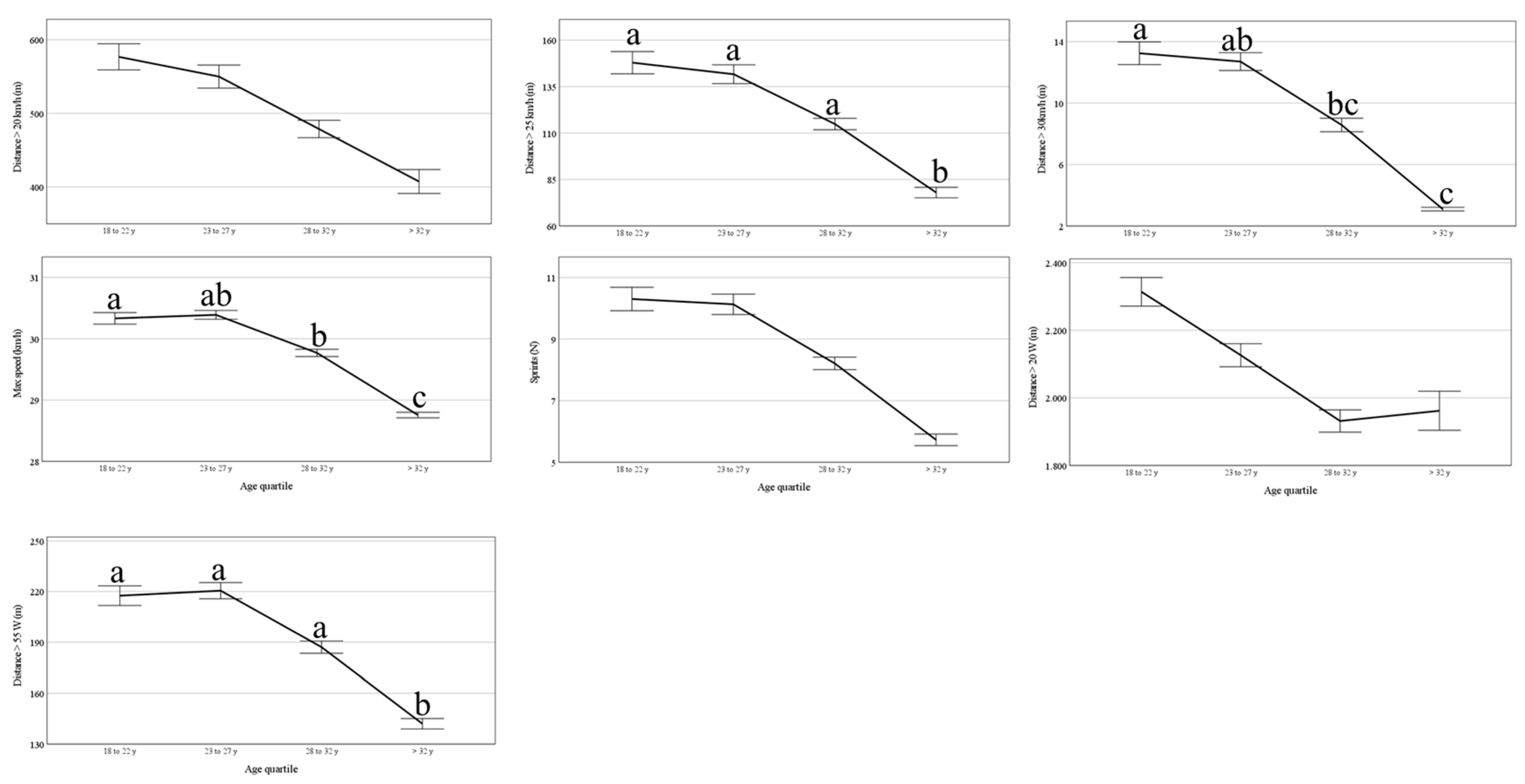 Results: showed that players over 32 years experienced declines in high-intensity and explosive actions, while endurance remained relatively stable with age. Peak performance occurred around 25.7 years for speed, 24.8 years for endurance, and 26 years for explosiveness. Conclusions: Overall, players aged 17–26 years demonstrated the highest physical performance, with notable declines observed in older age groups.