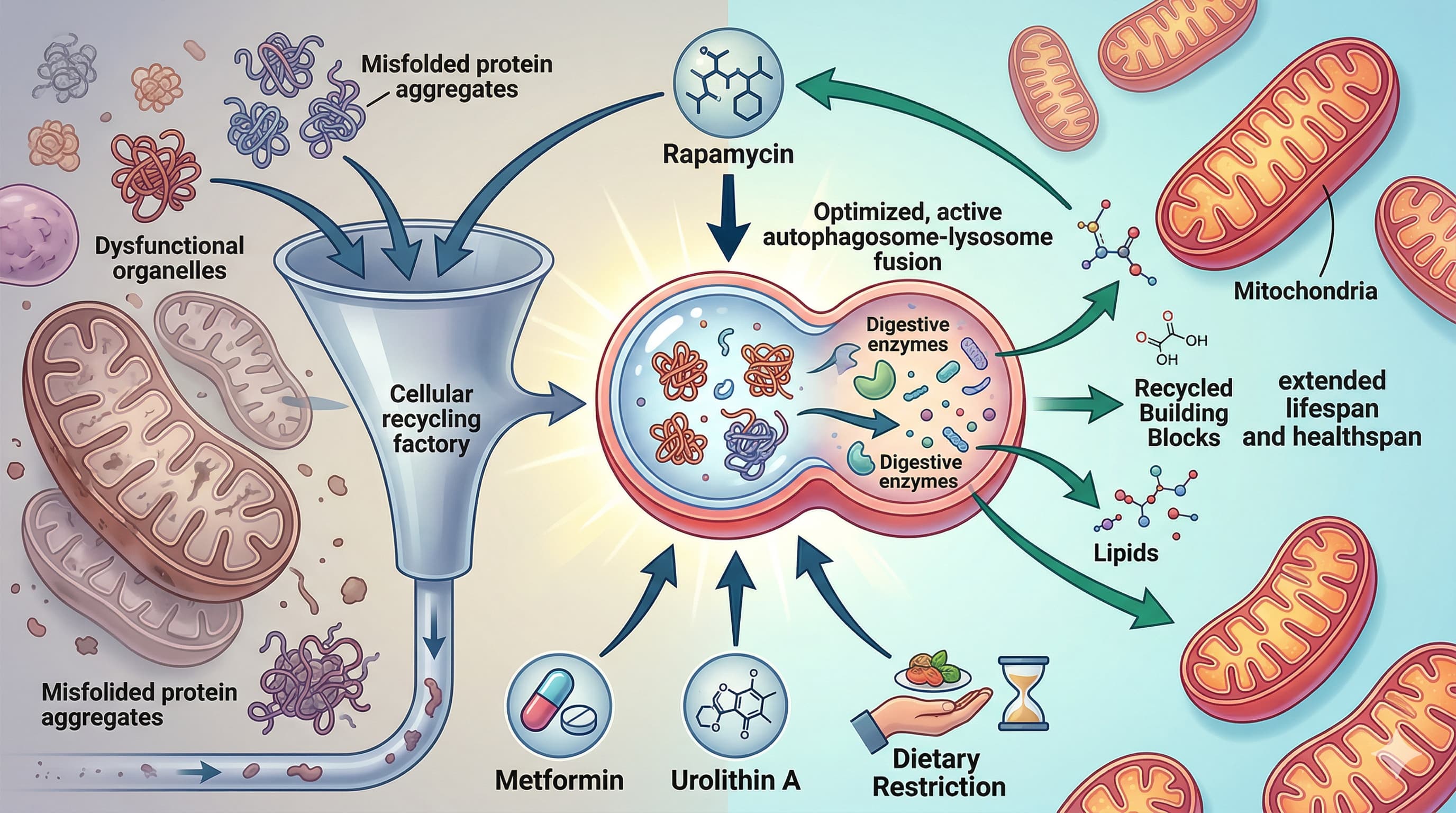 The ultimate holy grail in longevity research isn’t a silver bullet; it is the optimization of a cellular trash disposal system known as autophagy. A 2026 review explicitly links the lifespan-extending benefits of popular pharmacological agents (like rapamycin, metformin, and urolithin A) and lifestyle interventions (dietary restriction, exercise, sleep, and temperature stress) directly to this conserved cellular recycling mechanism. What makes this paradigm-shifting is the mounting evidence that these seemingly disparate biohacking strategies are just different physiological roads leading to the exact same metabolic destination: clearing out misfolded proteins and dysfunctional organelles to prevent age-related decline.