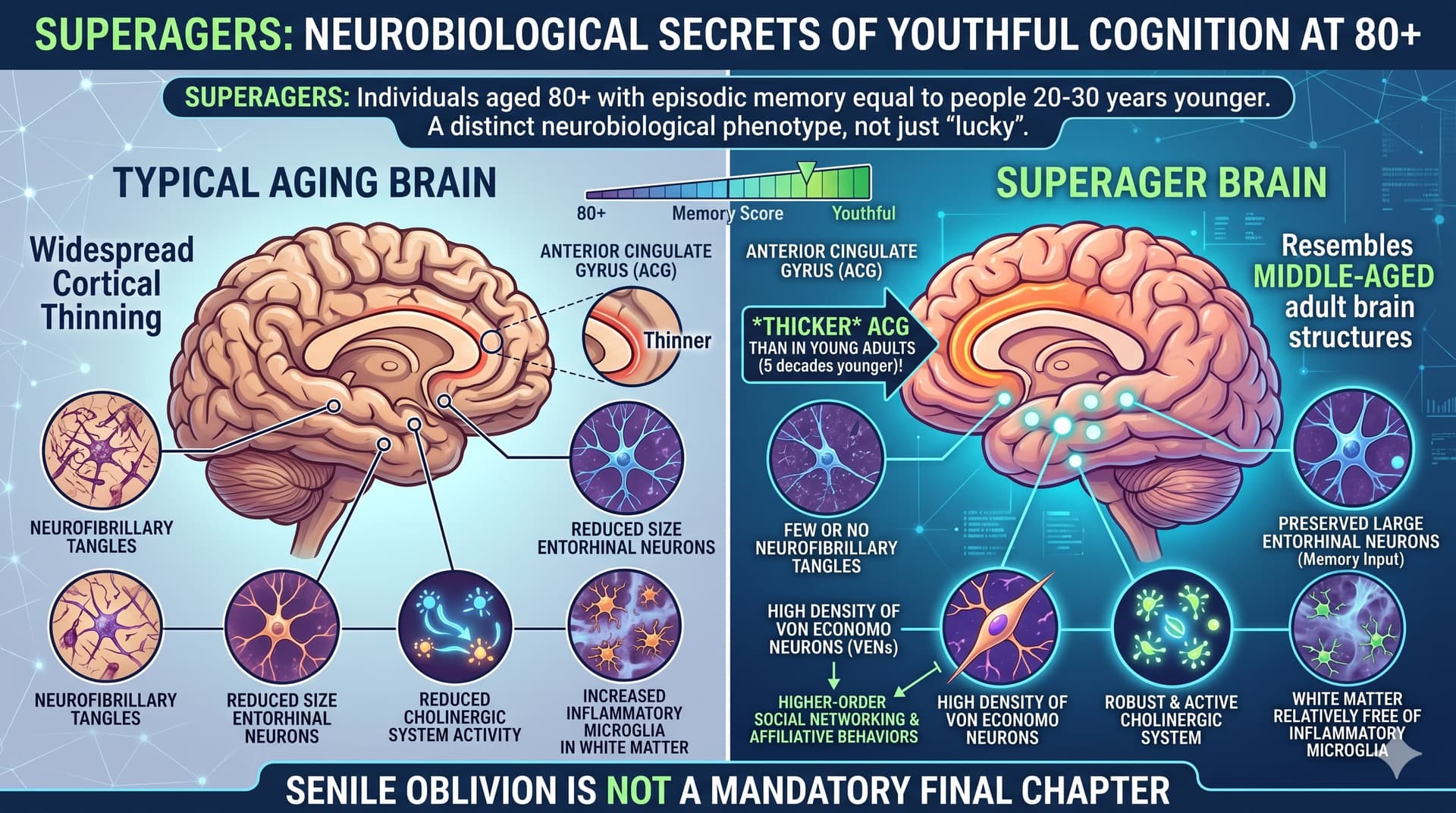 Superagers are individuals aged 80 and older who possess episodic memory scores at least equal to those of people 20 to 30 years younger. They are not merely “lucky” average agers; they represent a distinct neurobiological phenotype. While neurotypical seniors show widespread cortical thinning, Superagers exhibit brain structures that mirror those of middle-aged adults. Most remarkably, a specific region—the anterior cingulate gyrus—is actually thicker in Superagers than in individuals five decades younger.