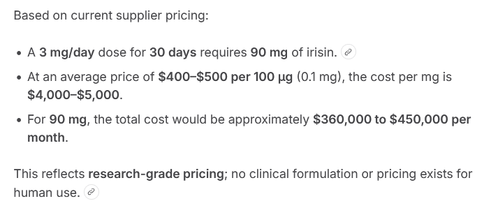 but I hear what yo are saying. My original response was to a) show how unrealistic recombinant irisin would cost, and b) noticed pinealon claimed to increase its expression.