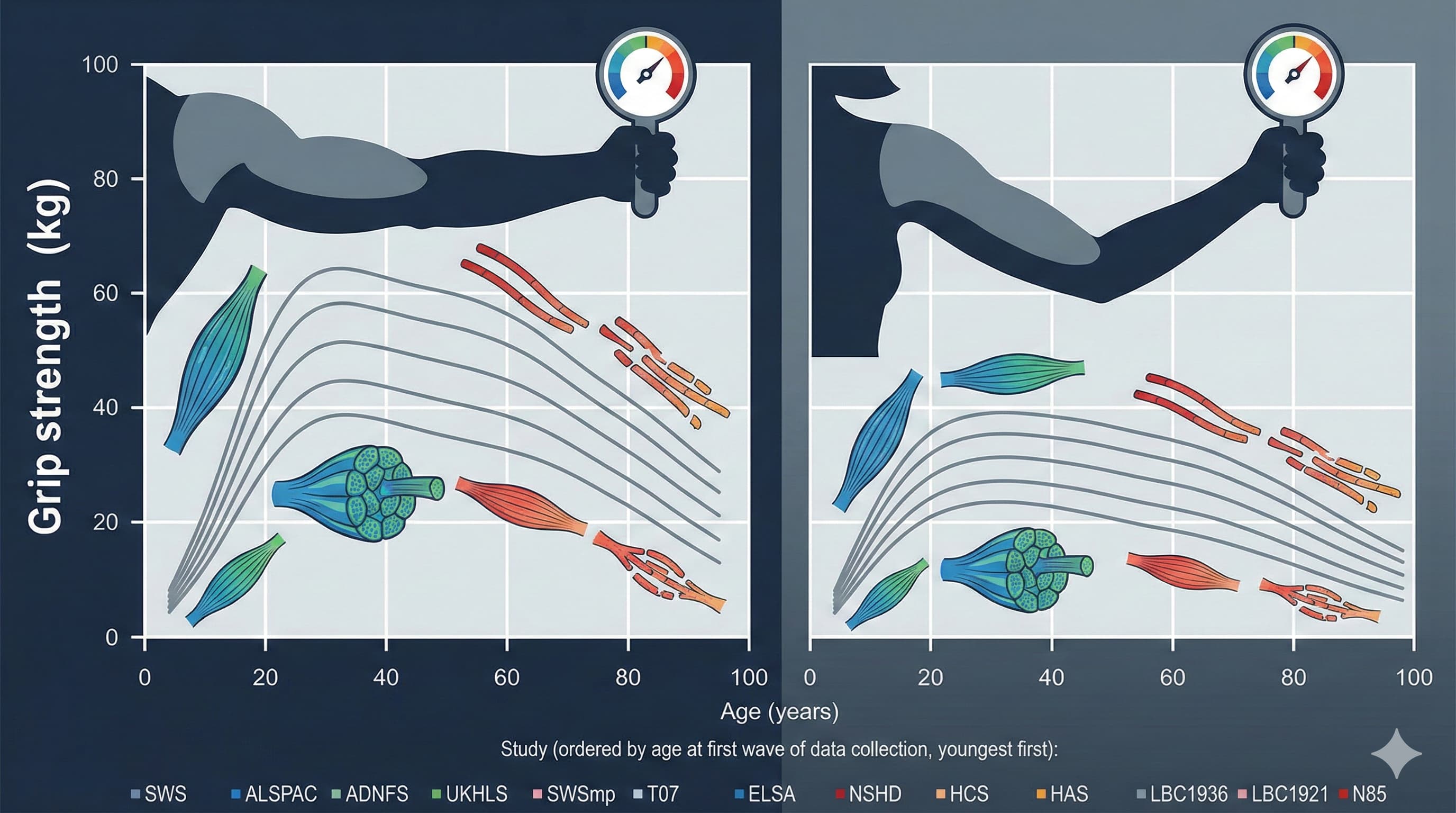 Neuro-Aging (The Denervation Cycle): The degradation of the Neuromuscular Junction (NMJ) is not a byproduct but a driver of sarcopenia. Fast motor units die off; surviving slow motor units sprout axons to “adopt” the orphaned fast fibers. This converts them to slow or “hybrid” fibers (Type I/II co-expression), preserving mass but sacrificing explosive power.
