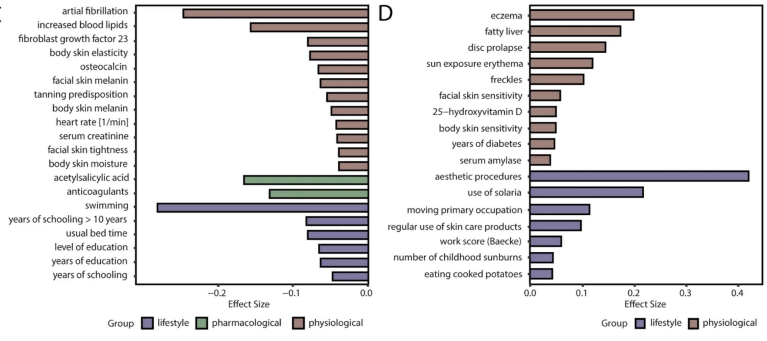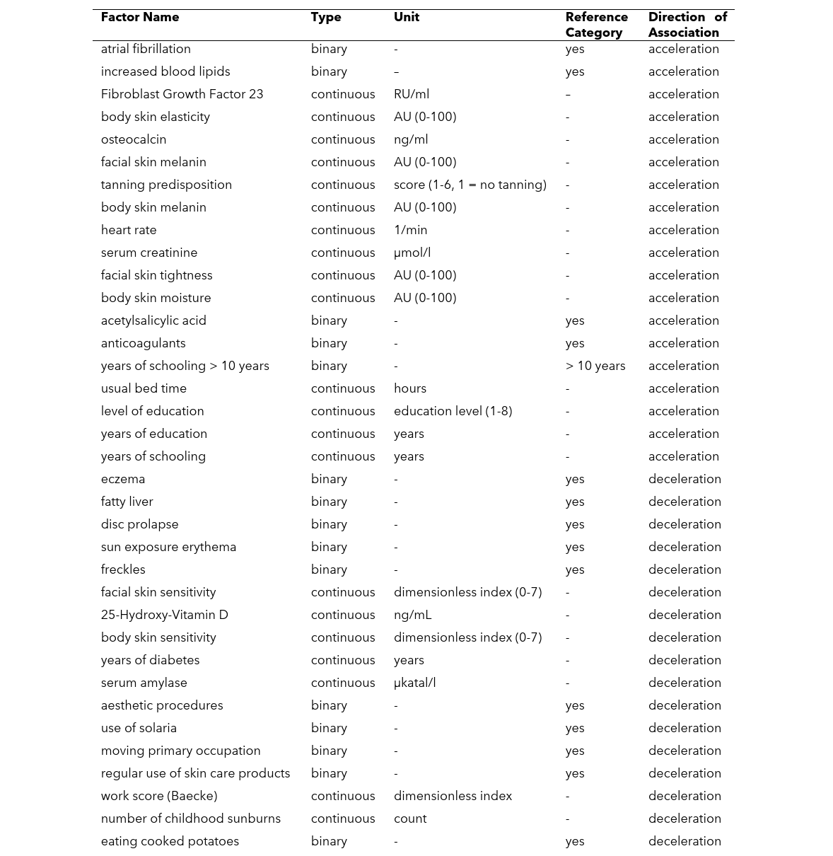UV Exposure Proxies: Variables such as elevated 25-hydroxyvitamin D (accelerator) and high tanning predisposition/melanin (decelerators) emphasize the dominant role of UV radiation in skin aging. Additional controlled data is required to disentangle endogenous molecular resilience from simple behavioral photoprotection or phenotypic UV resistance.