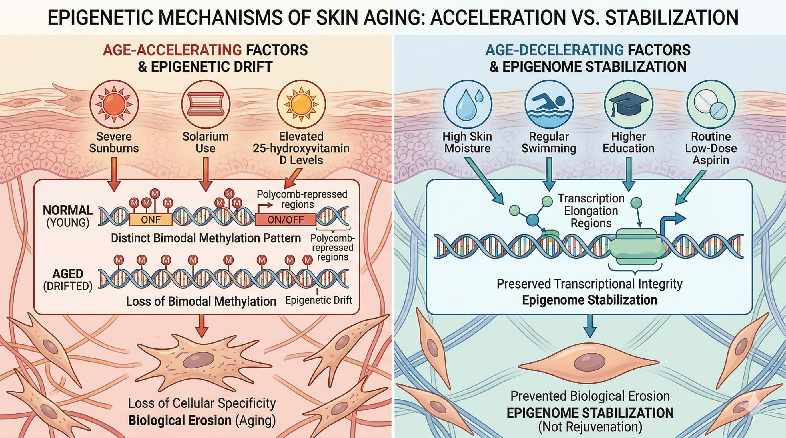 What sets this study apart is its deep dive into how these factors operate. The researchers discovered that age-accelerating factors—such as a history of severe sunburns, solarium use, and elevated 25-hydroxyvitamin D levels—promote “epigenetic drift”. This drift is characterized by a loss of the bimodal DNA methylation patterns necessary for maintaining cellular specificity, particularly in polycomb-repressed regions. Conversely, age-decelerating factors—including high skin moisture, regular swimming, higher education, and the routine use of low-dose aspirin—target transcription elongation regions. Rather than actively rejuvenating the skin, these positive factors seem to stabilize the epigenome, preserving transcriptional integrity and preventing the biological erosion associated with age.