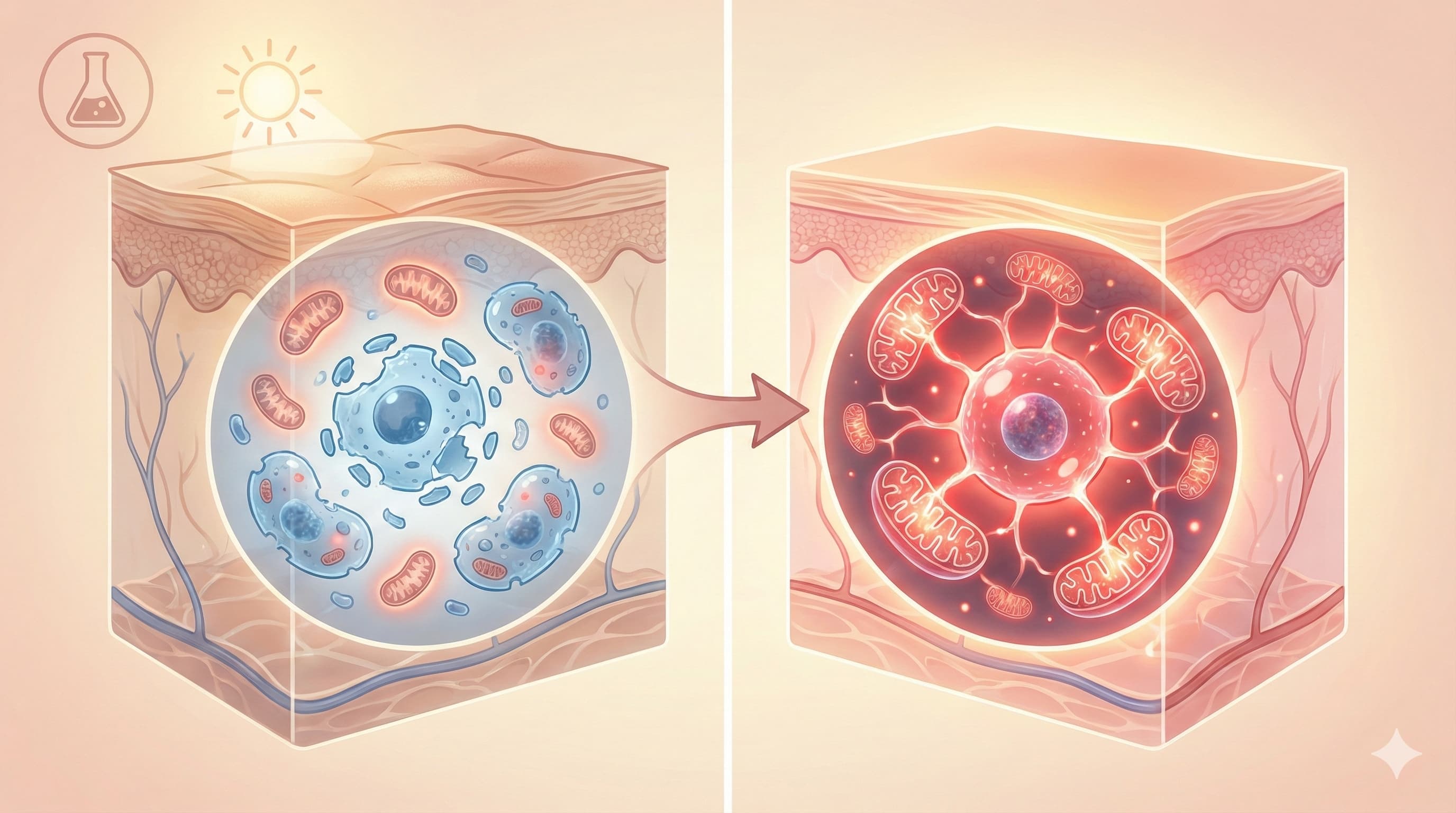 The mechanism is mitohormesis—a biological “controlled burn.” By using 5-aminolevulinic acid (ALA) and red light to induce a mild, temporary stress on mitochondria, the treatment forces skin cells to activate powerful survival and repair programs (ISR/UPR). The critical discovery here is metabolic: this hormetic stress actively clears Citrate (CA), a metabolite that was found to accumulate in and drive cellular senescence. By unclogging this metabolic jam, the treatment effectively “de-ages” the skin, restoring collagen structure, reducing wrinkles, and clearing senescent “zombie” cells without killing healthy tissue. This establishes a direct link between mitochondrial metabolism and the structural reversal of photoaging, validating a targeted, low-toxicity intervention for longevity enthusiasts.