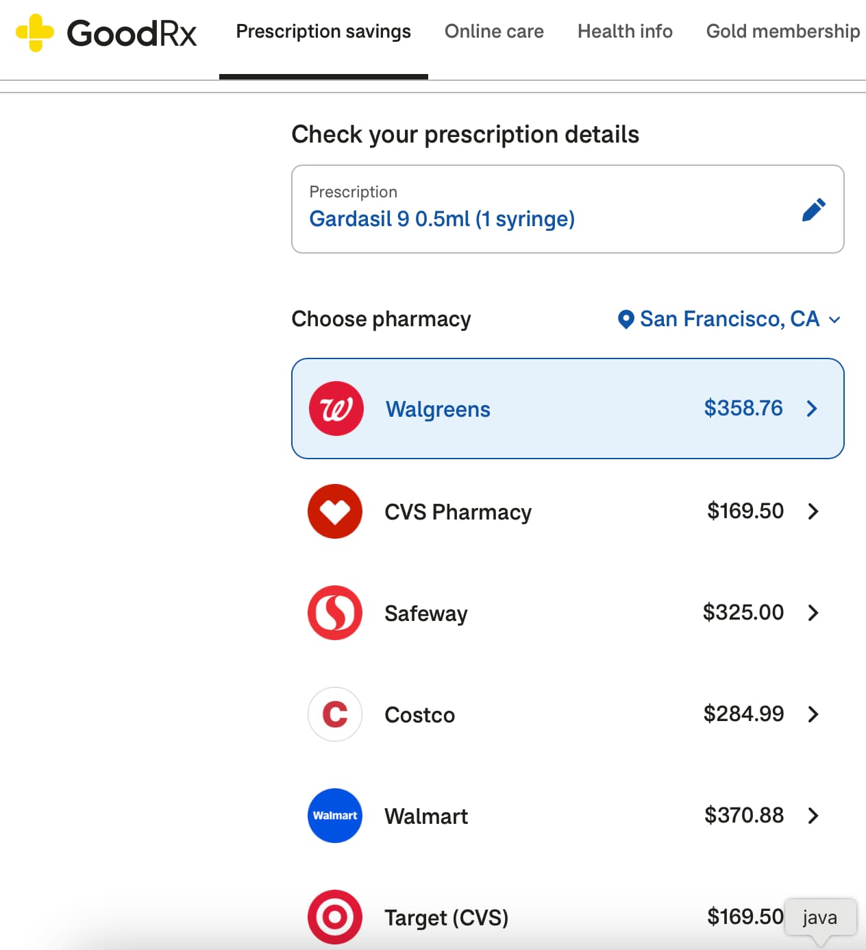 Example of Pricing using GoodRX (best pricing seems to be around $170 per injection syringe):