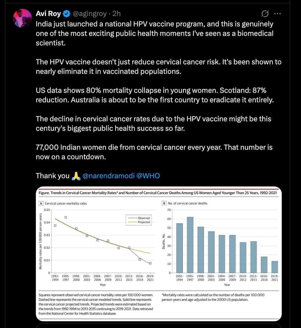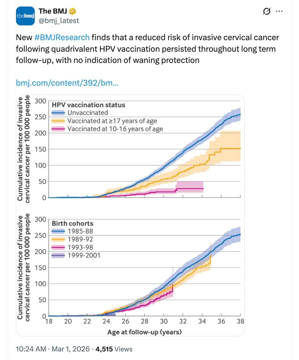 While the graph shows good news, in fairness, I donāt think it is really showing that the HPV vaccine is doing this. The number of deaths is absolutely tiny - 10-50 deaths per 2 years. (No surprise, because dying of cervical cancer at less than 25 years old is insanely unlucky.) I also believe that younger people are having way less sex than previous generations, which would reduce virus transmission. I do strongly support the vaccine, but I think the biggest benefits are yet to come as those women get older. The graph even says āprobablyā and thus the description alongside is quite misleading.