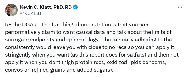 And the clowns doesn’t apply this criteria to their other recommendations like protein, where weight management outcomes is okay, but for reducing SFA we needed CHD/mortality. They’re targeting a surrogate endpoint!?