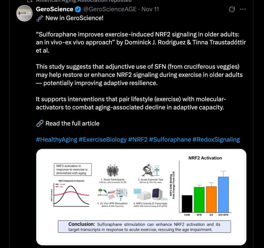 This is a really cool concept. I hope they will next test it in vivo using a standardized sulforaphane supplement! I’ve wondered for literally decades if pre-exercise lipoic acid supplementation (which also activates NRF2) could be used to augment the beneficial effects of exercise.