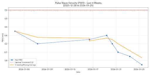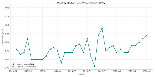 Actionable longevity science treats PWV as a proxy for biological aging. Lowering PWV effectively “rewinds” vascular age.