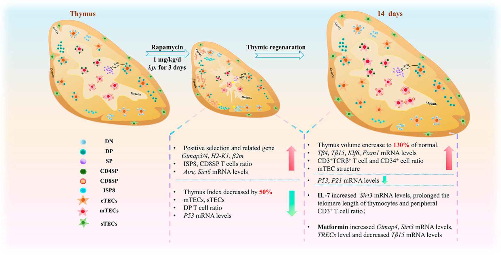 - RAPA caused acute thymic involution, with ~46% weight loss and cortical/medullary disruption, loss of medullary (mTECs) and subcapsular (sTECs) epithelial cells, reduced double-positive (DP CD4⁺CD8⁺) thymocytes, and shortened thymocyte telomeres.