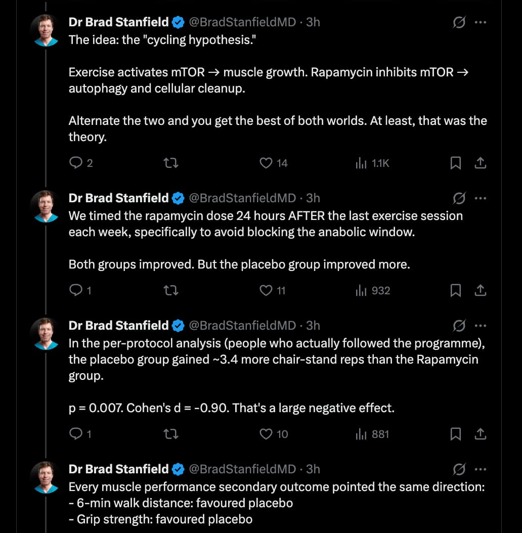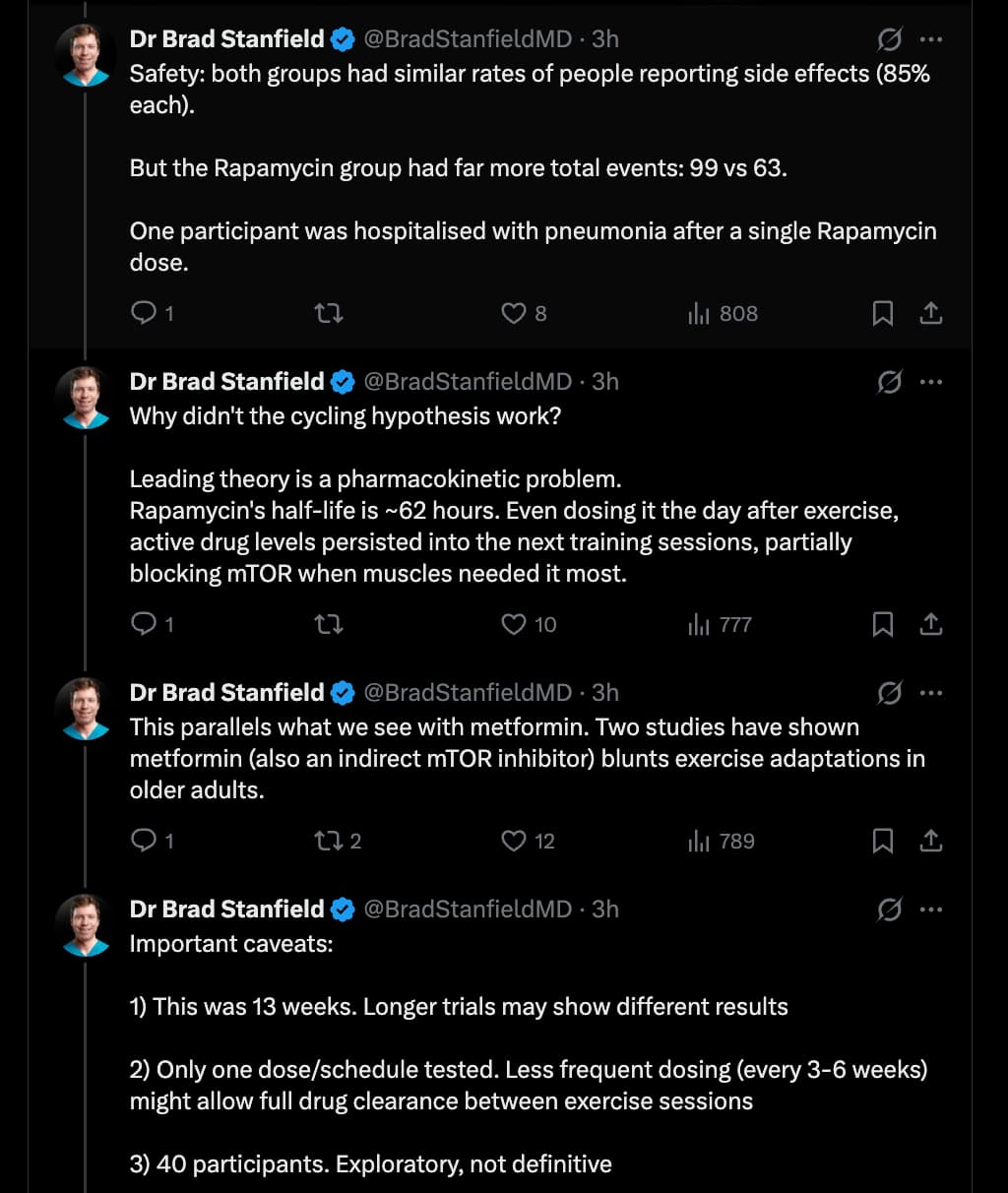 My own view on Brad Stanfield’s work is that the outcome is what would be mechanistically predicted. It does warn people off weekly dosing which IMO is helpful, but to me it was obvious that weekly dosing is suboptimal. One should really conclude that mTOR has a function and unless someone has medical reasons to suppress the immune system, it should be allowed to run free part of the time.