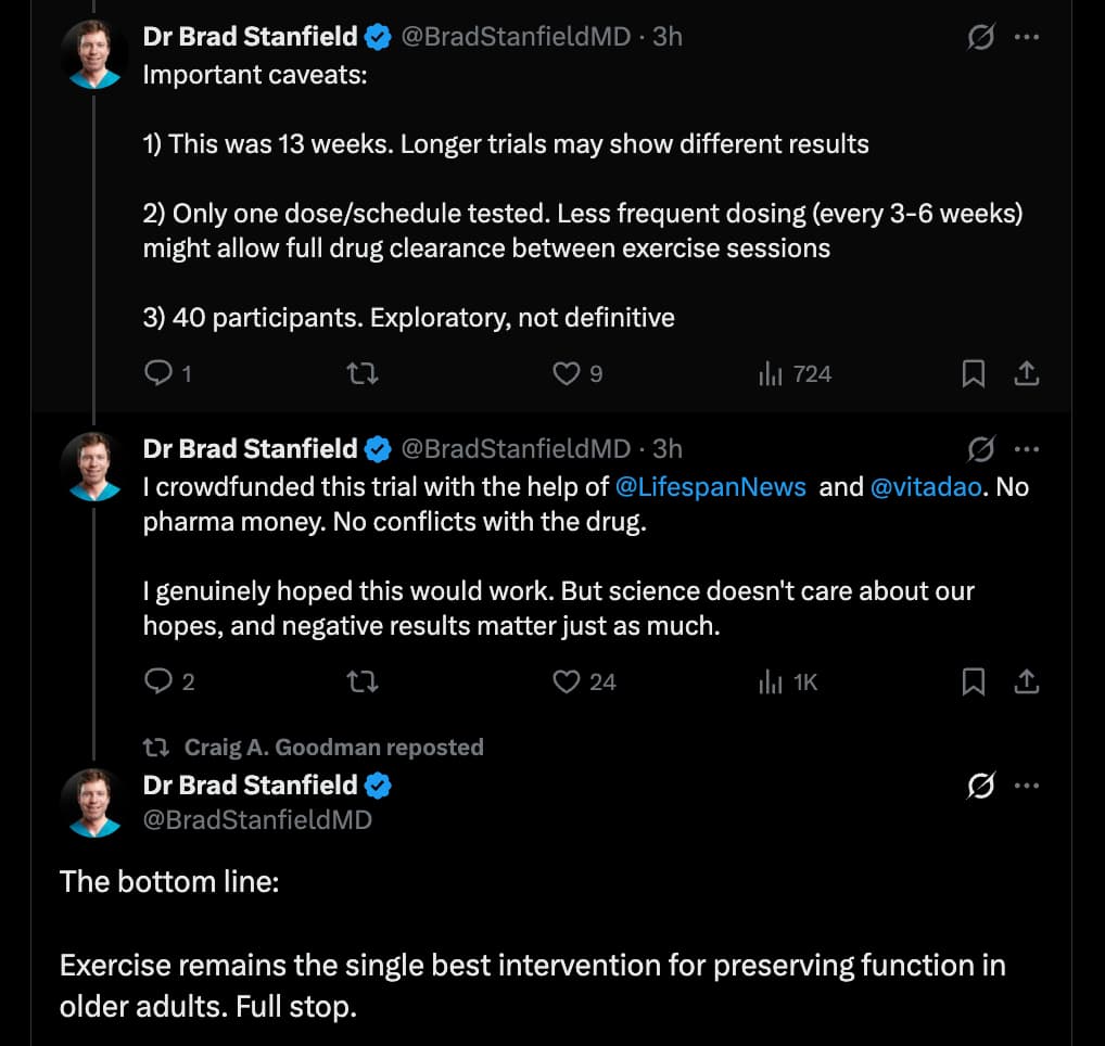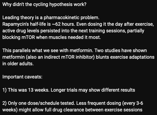 The paper’s main weakness is that it cannot cleanly separate “rapamycin is bad for exercise adaptation” from “this specific dose/timing regimen was poorly matched to the exercise schedule.” So it weakens the simple version of the cycling hypothesis, but does not fully kill the broader idea that a different cadence or longer interval could work better.