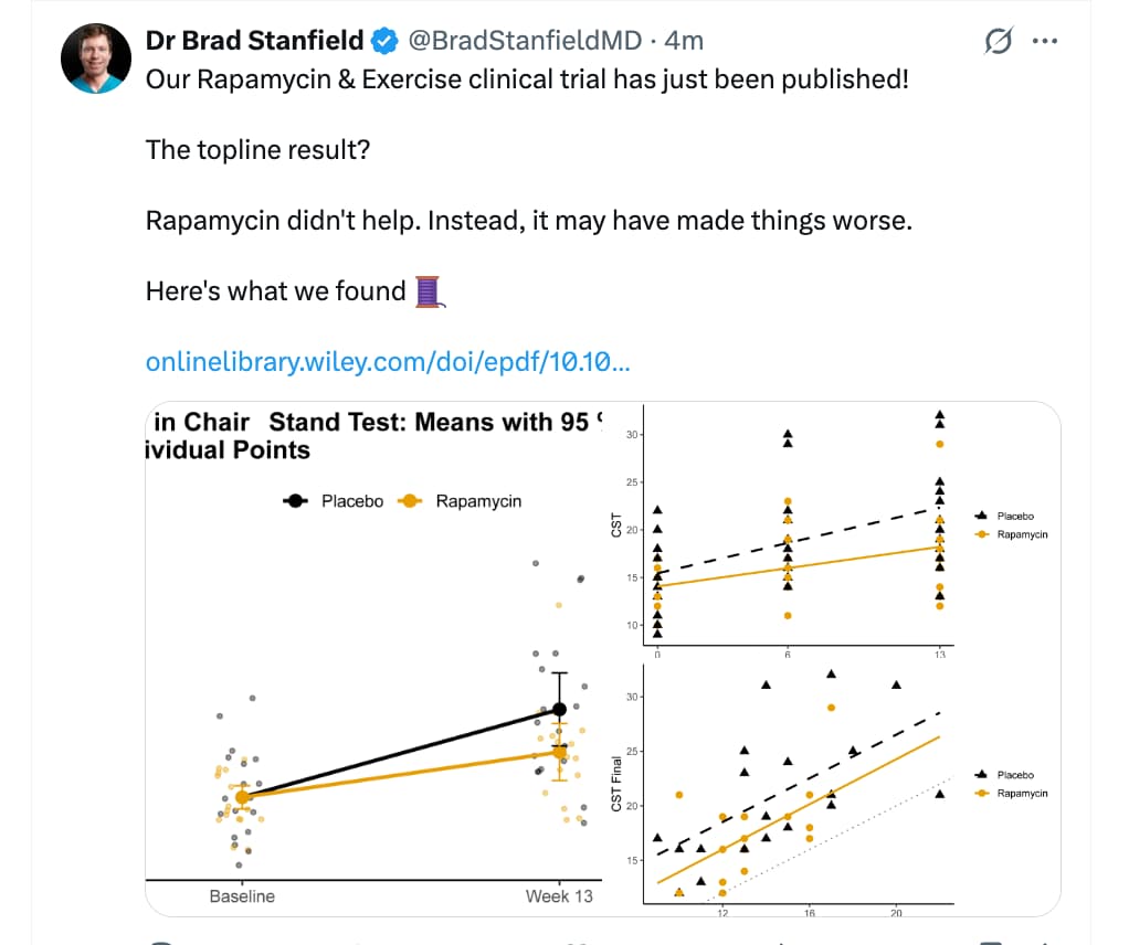 The trial results severely challenge the translational viability of this cycling hypothesis. While both cohorts improved their baseline 30-second chair-stand performance, the intention-to-treat analysis revealed a negative effect size for the sirolimus group compared to placebo (-2.13 repetitions). Furthermore, per-protocol and complete-case sensitivity analyses demonstrated a statistically significant attenuation of functional strength gains in the active treatment arm. Secondary functional measures, including 6-minute walk distance and grip strength, also favored the placebo group, although they did not reach statistical significance.