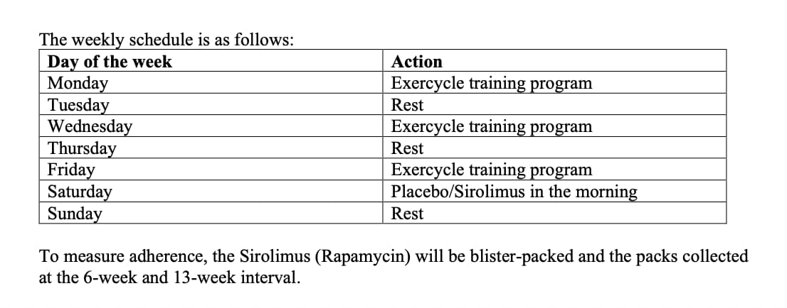 Brad started this effort about 4 years ago, and the full outline of the original clinical trial proposal and protocol can be viewed in this thread: Rapamycin Exercise Study Moves Forward: Dr. Brad Stanfield's Study Registered in NZ