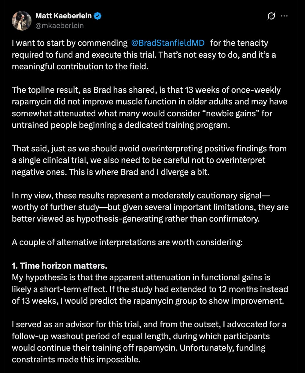 I think people are reading too much into this trial. I don’t think the results suggest that rapamycin is detrimental at all. For short term exercise gain it may be detrimental, and if that’s all you care about then you might want to stay away from it. But the trial couldn’t possible answer whether it has beneficial effects on aging in humans.