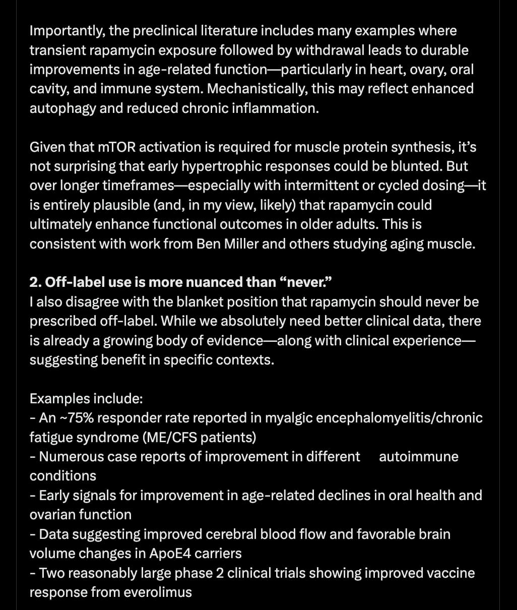 It’s your decision but you are wrong in my opinion. This study showed/told us exactly what we knew all along that Mtorc inhibition while good (maybe even great) for longevity, it is detrimental to exercising and muscle growth. Last time I checked calorie restriction (which has been shown to have the highest impact in longevity in mammals to date) is not so good if you want to gain muscle either. If you are after longevity, you MUST keep doing Rapa. If you only care for big muscles, then you most likely will do better if you stop it. IMO you can either chose big muscles and an average lifespan, or average muscles (think of a swimmer’s body) and live much longer (like at least 20 years longer than with big muscles). Of course, it is way more nuanced (and when I say big muscles I mean huge like the body builder types) but at the end of day not too many bodybuilders seem to be reaching the supercentenarian status. To each their own, but IMO this study proved once again that RAPA is great for longevity.