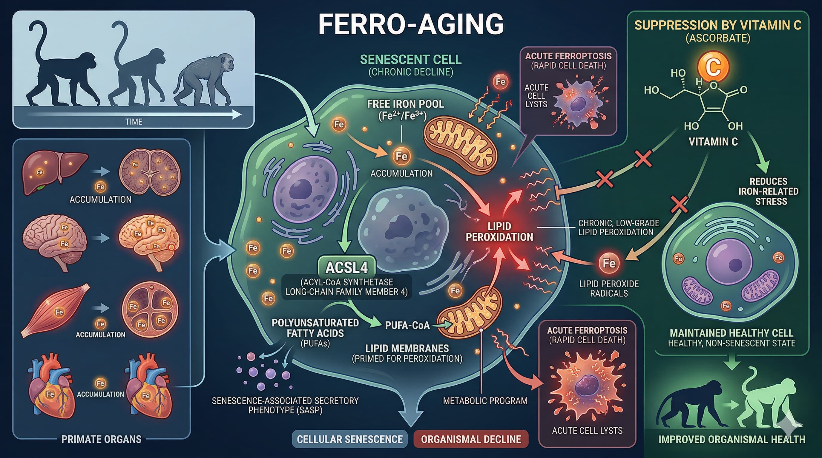 1. If Vitamin C is a potent ACSL4 inhibitor, why have previous large-scale, high-dose longevity and cardiovascular RCTs failed to show significant lifespan extension? Answer: Previous trials viewed Vitamin C purely as a systemic antioxidant rather than a targeted enzyme inhibitor. It is highly probable that typical supplemental dosing achieves plasma saturation (approx. 80 micromolar) but fails to reach the intracellular concentrations required to competitively inhibit the ACSL4 binding pocket across all tissue types, particularly in organs with high lipid turnover. Furthermore, generic antioxidant trials often fail because they indiscriminately suppress necessary hormetic ROS signaling.