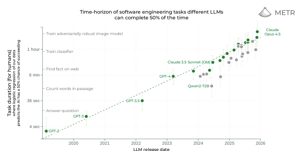 Recently published: highest METR score now for 50% success rate (not for 80%). A 5 hour software engineering task is a measure of time it takes for a human.