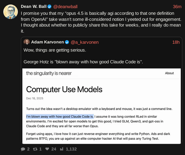 " it is why I also believe that opus 4.5 in claude code is basically AGI. "