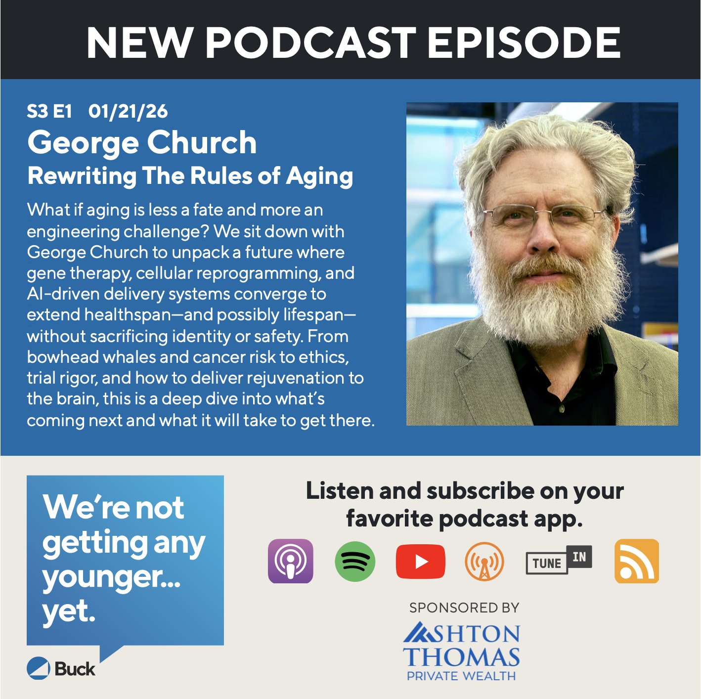 The New 2026 season of Buck podcast “We’re not getting any younger…yet” launches tomorrow! 1st episode features Harvard geneticist George Church, one of the most provocative thinkers in the longevity field. Available wherever you get your podcasts. Subscribe - don’t miss single episode!