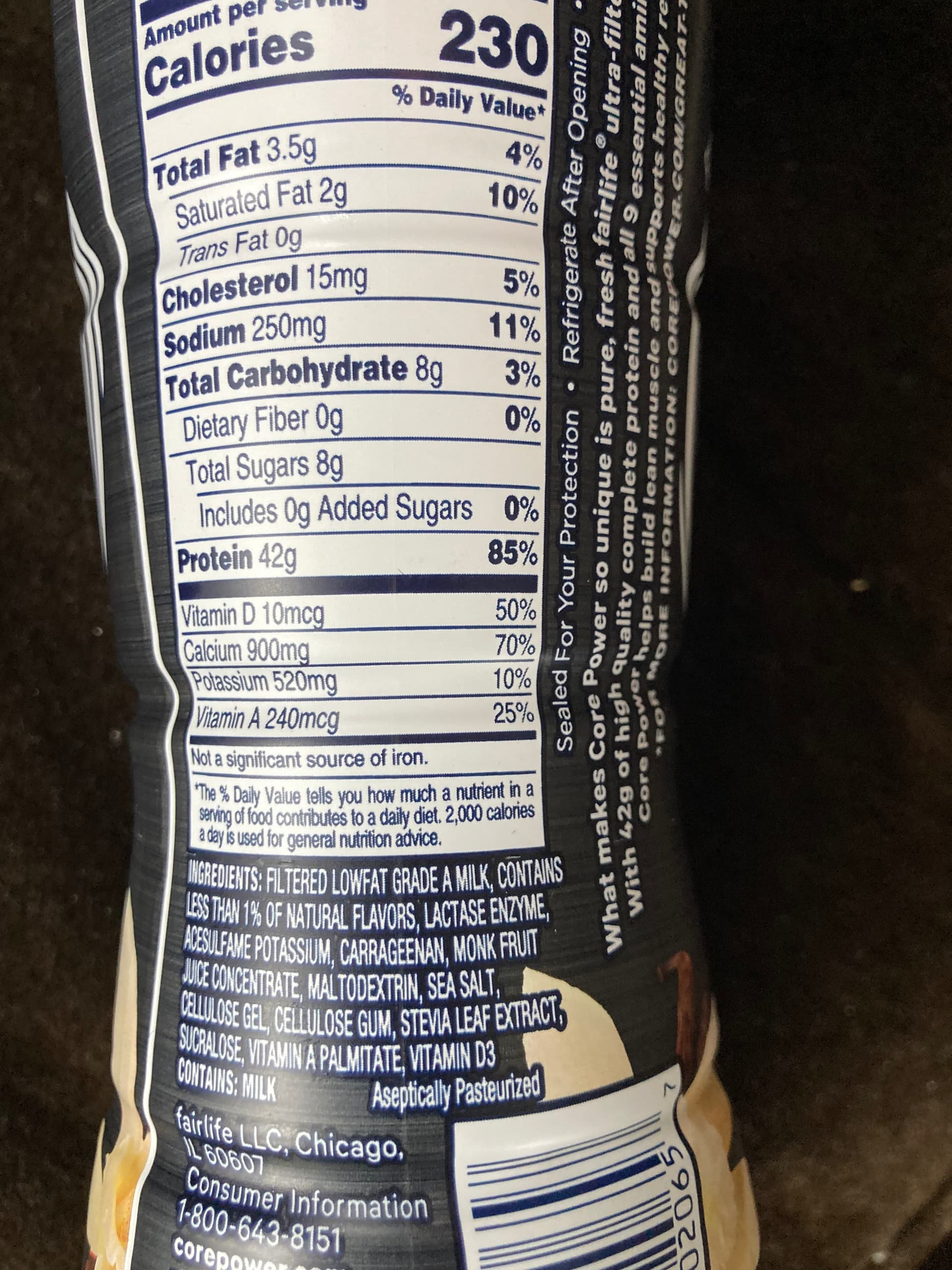 This product is Fairlife “CORE Power” protein milkshake. It contains protein from casein, obtained from highly processed milk plus a lactose enzyme,