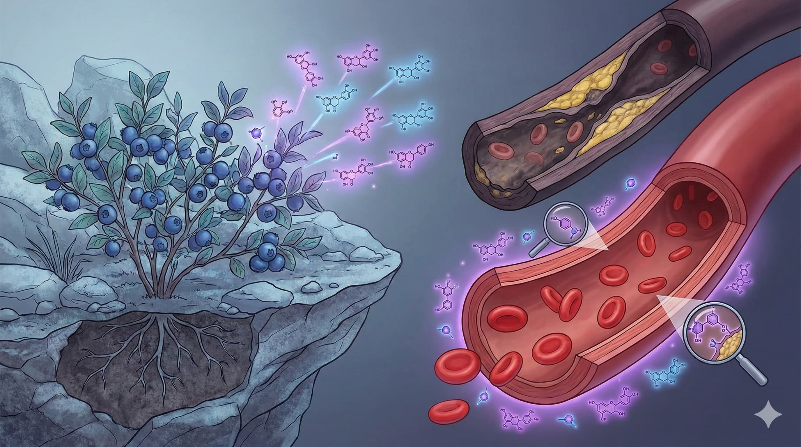 Elicitation Hypothesis: Explicitly links the harsh growing environment of wild blueberries to a superior polyphenol profile compared to cultivated variants, framing the fruit as a “stress-mimetic” food.