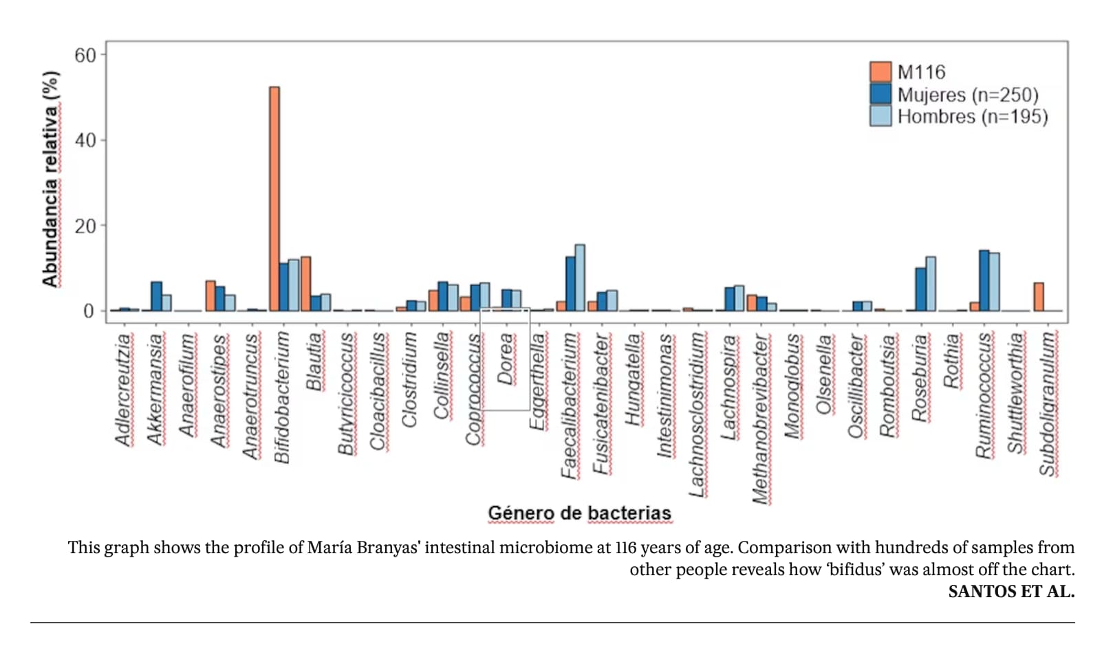Esteller thinks Branyas’s lack of inflammation could be linked to her healthy gut microbiome, which resembled that of a much younger person. He points to her high levels of Bifidobacterium, a genus of beneficial bacteria that was probably boosted by her diet, which included three daily servings of yogurt.