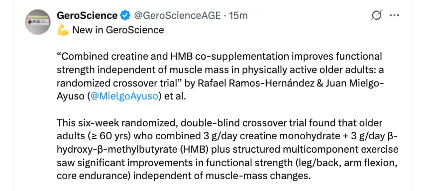 Full paper (PDF) here: Combined creatine and HMB co-supplementation improves functional strength independent of muscle mass in physically active older adults: a randomized crossover trial